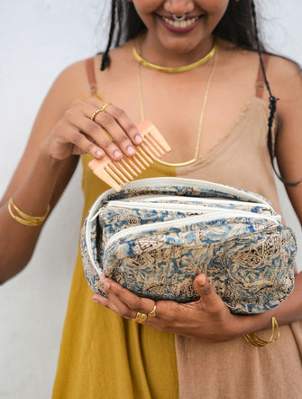 This quilted jewelry/makeup organizer is adorned with intricate Kalamkari prints, a traditional Indian art form that boasts a rich history of craftsmanship with hand-printed motifs and vibrant colors, making every piece a unique work of art. With multiple compartments of varying sizes, you can neatly arrange your cosmetics, brushes, skincare products, and accessories. No more digging through clutter – everything will have its designated place. The sturdy zipper closure ensures that your makeup essentials stay secure.