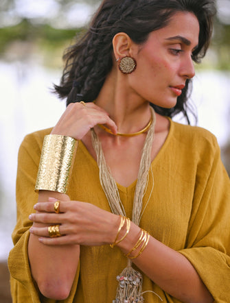 'Manika' is an embodiment of culture, craftsmanship, and personal style that transcends trends and celebrates the artistry of life. Curated with love and hand-hammered by skilled artisans who infuse their passion and expertise into every texture and curve of the design. The adjustable sizing ensures a comfortable fit for a variety of wrist sizes, allowing you to wear it snugly or slightly loose, according to your preference.